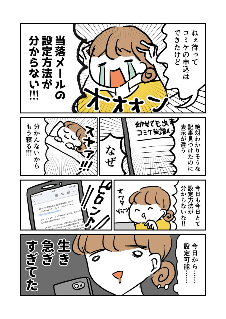 コミケの当落メールの設定方法がわからない。調べても調べても、手順に載っている画面に辿り着けない。もう寝るしかない。