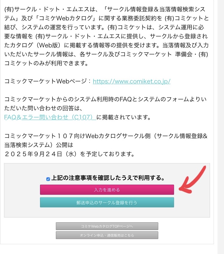 「上記の注意事項に〜」にチェックをし、「入力を進める」をタップ。スマホの画面だと一番下の方にあります。