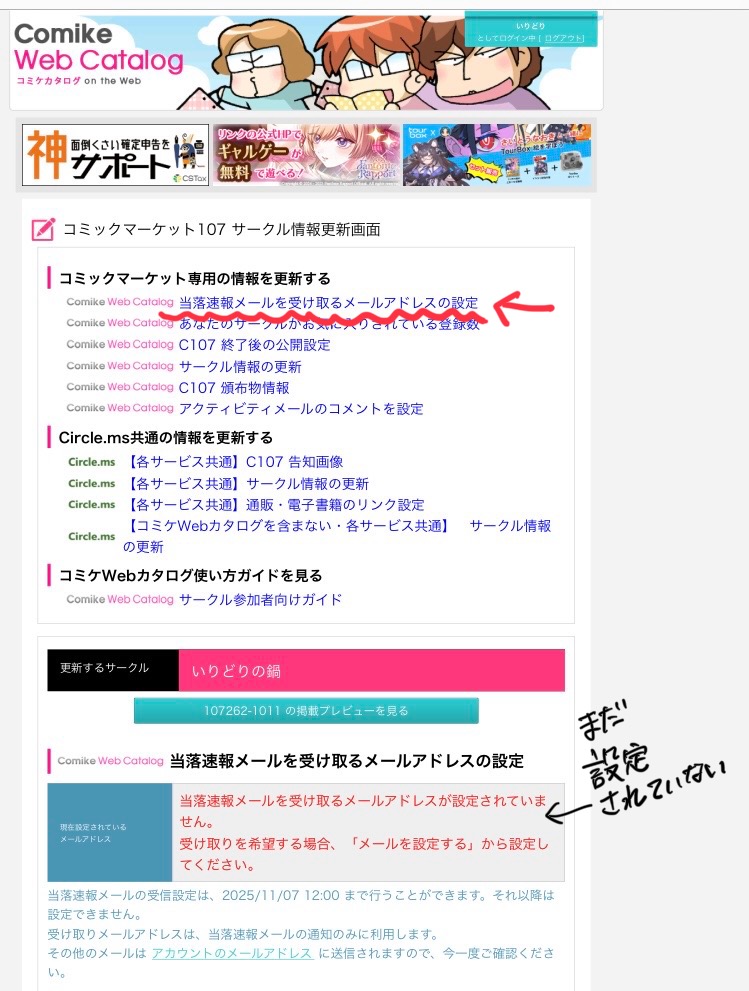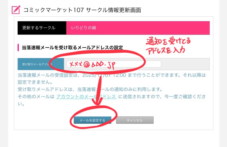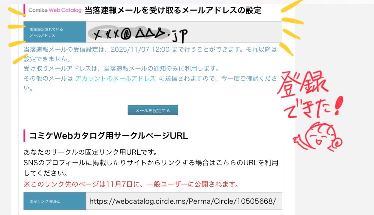C107、2025年冬コミの申し込みが完了しました。しかし、ここで完全に気を抜いてはいけません。俺たちは「当落メール設定」という偉業を成し遂げなくてはいけないのです。