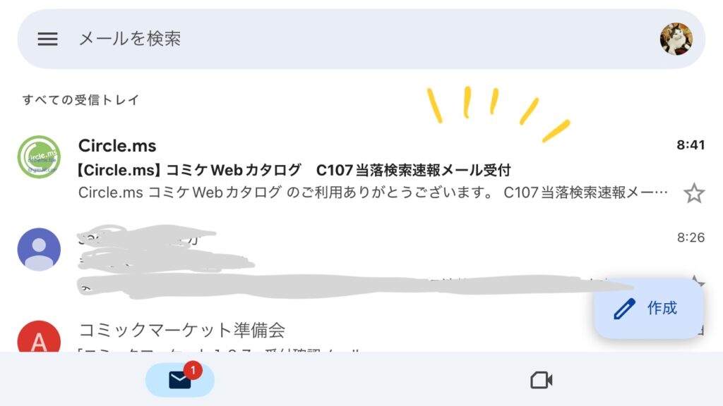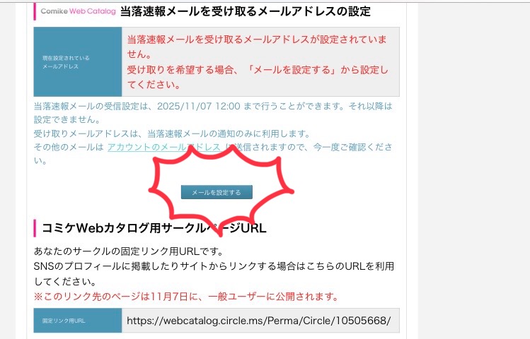 コミケの当落発表当日は、Xのライムラインに「コミケ受かりました!」「落ちました!」の報告が大量に流れます。ちなみにC107の当落発表は11月7日。私もこれに乗っかりたい。であれば、①の当落メールの設定をしておく必要があるのです。